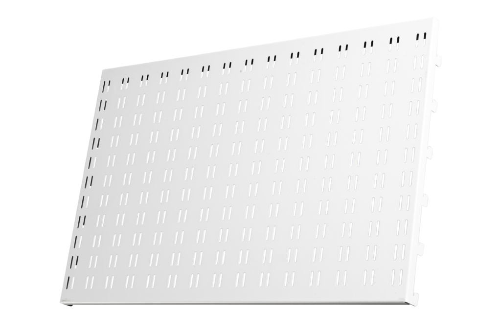 Förvaringstavla för att förvara och skapa ordning bland mindre saker och verktyg. Komplettera med Lundbergs krokar, hyllor och boxar. Integrerade fästen för montering mellan två hängskenor. Finns i 2 olika bredder.