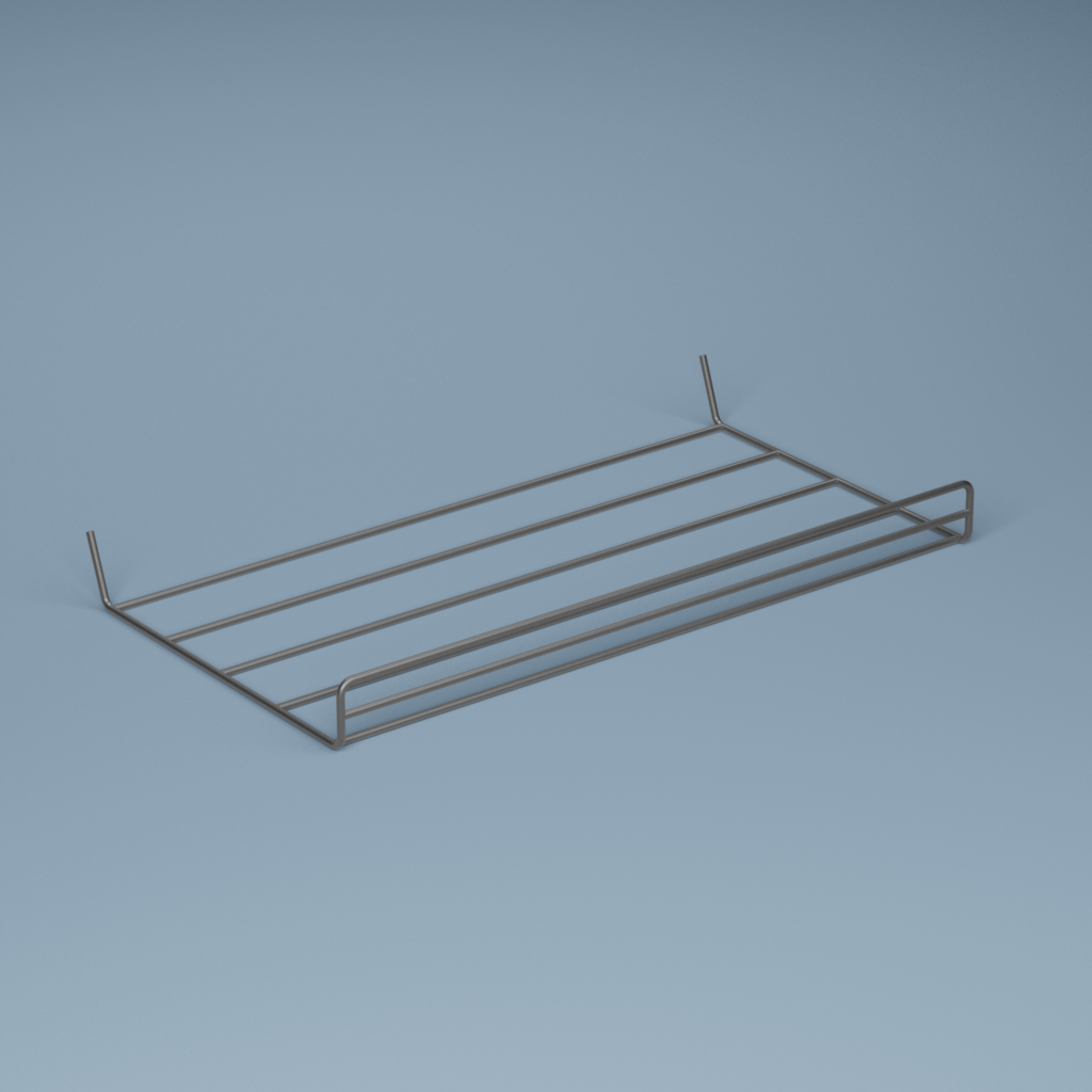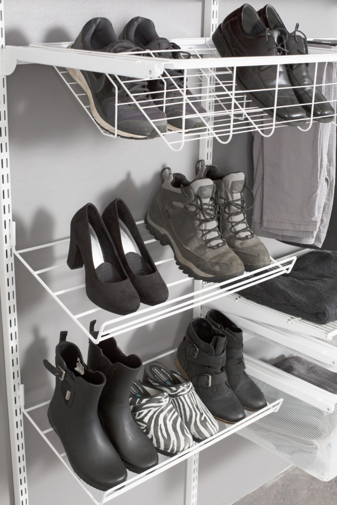 Skohylla med enkelfäste för seriemontering på skenpar eller väggfästen med centrumavstånd 600 mm.