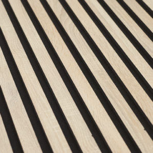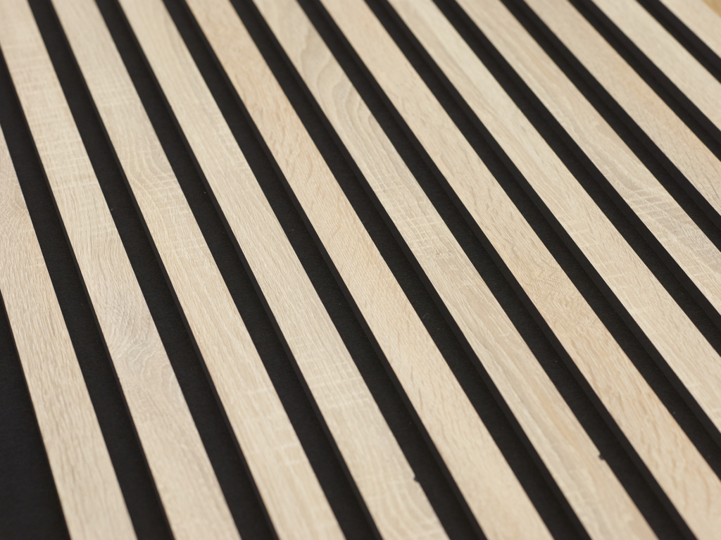 - Akustikpanelen består av 12 stycken ribbor med en genomfärgad svart MDF-kärna som har en naturtrogen dekor.
