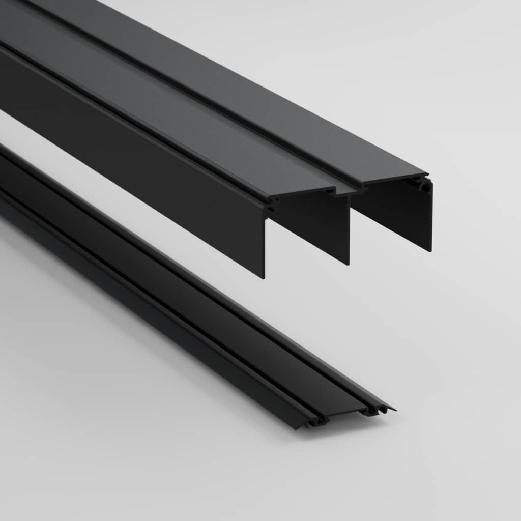 Svart tak- och golvskena i aluminium till skjutdörr Decotique. Takskenans mått: 1803x90x40. Golvskenans mått: 1803x55x5.