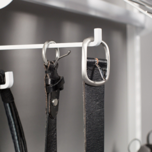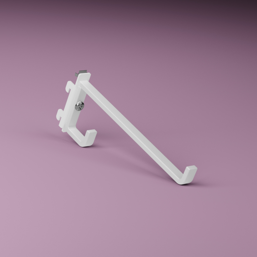 Dubbelkrok som monteras i häng- eller väggskena. Övre krok 160 mm djup.