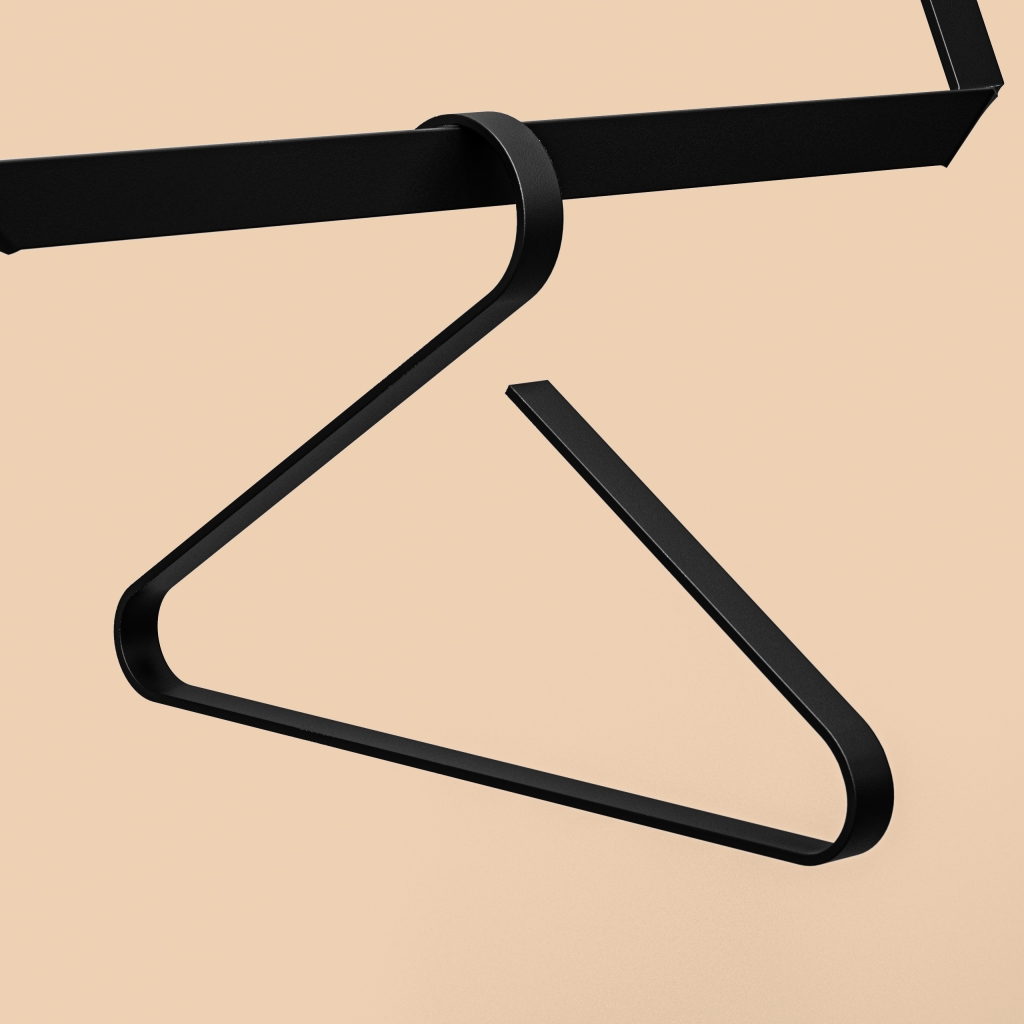 Vår galge i metall är en utmärkt kombination av minimalistisk design och hög funktionalitet. Pulverlackerad i den intensiva svarta nyansen NCS S-9000, erbjuder den en robust yta som tål dagligt slitage. Även utan förborrade hål behåller den sin eleganta form, vilket gör den till en perfekt detalj i ett modernt och stilrent hem.