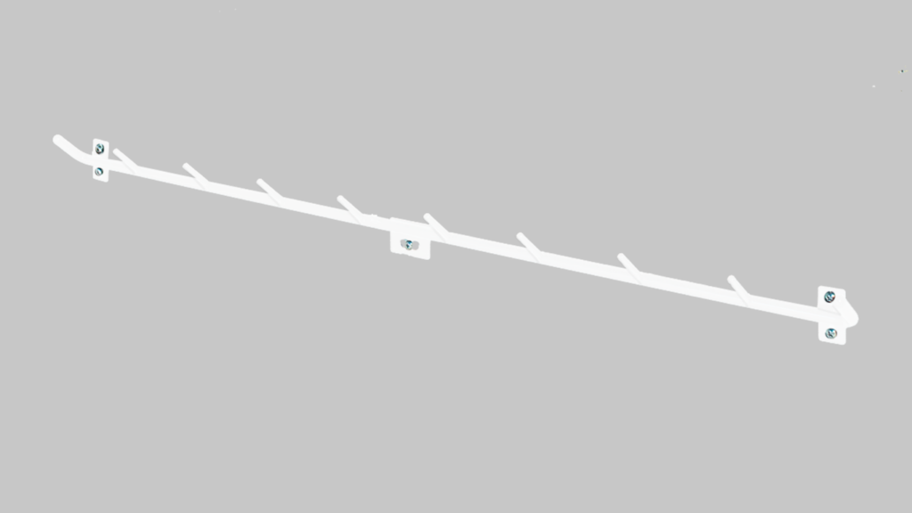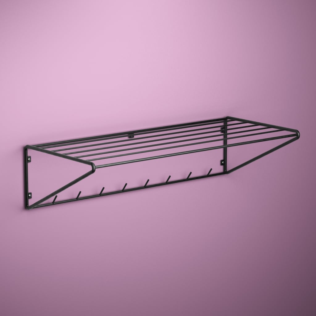 Ett av hemmets viktigaste rum är hallen. Hedda är en enkel, funktionell och stilren vägghängd hatthylla i svart pulverlackerad metall. Praktisk förvaringsyta upptill för halsdukar, hattar, handskar mm. 8 st krokar och stång för galgar.