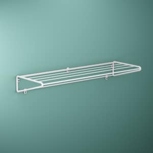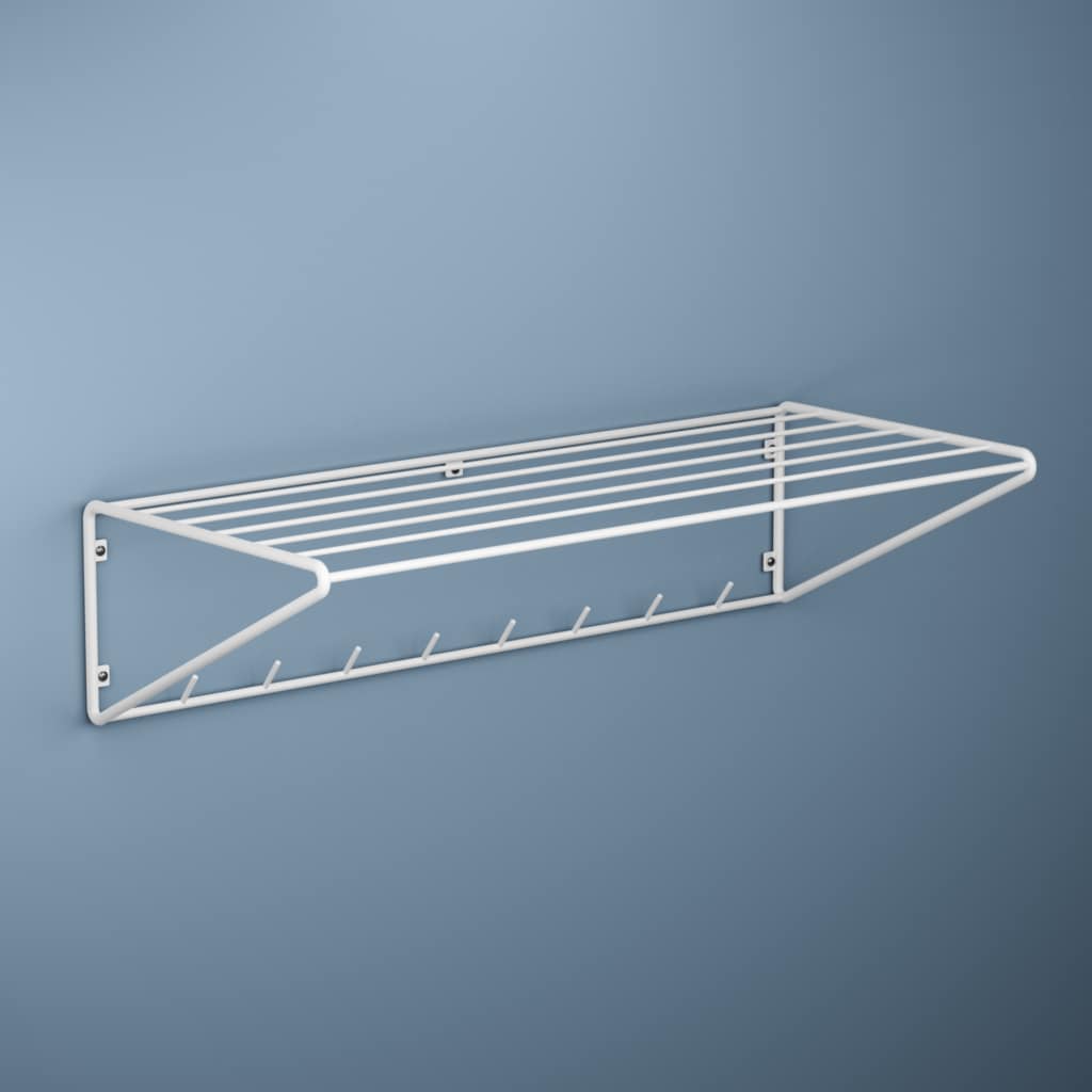 Ett av hemmets viktigaste rum är hallen.Hedda är en enkel, funktionell och stilren vägghängd hatthylla i vit pulverlackerad metall. Praktisk förvaringsyta upptill för halsdukar, hattar, handskar mm. 8 st krokar och stång för galgar.