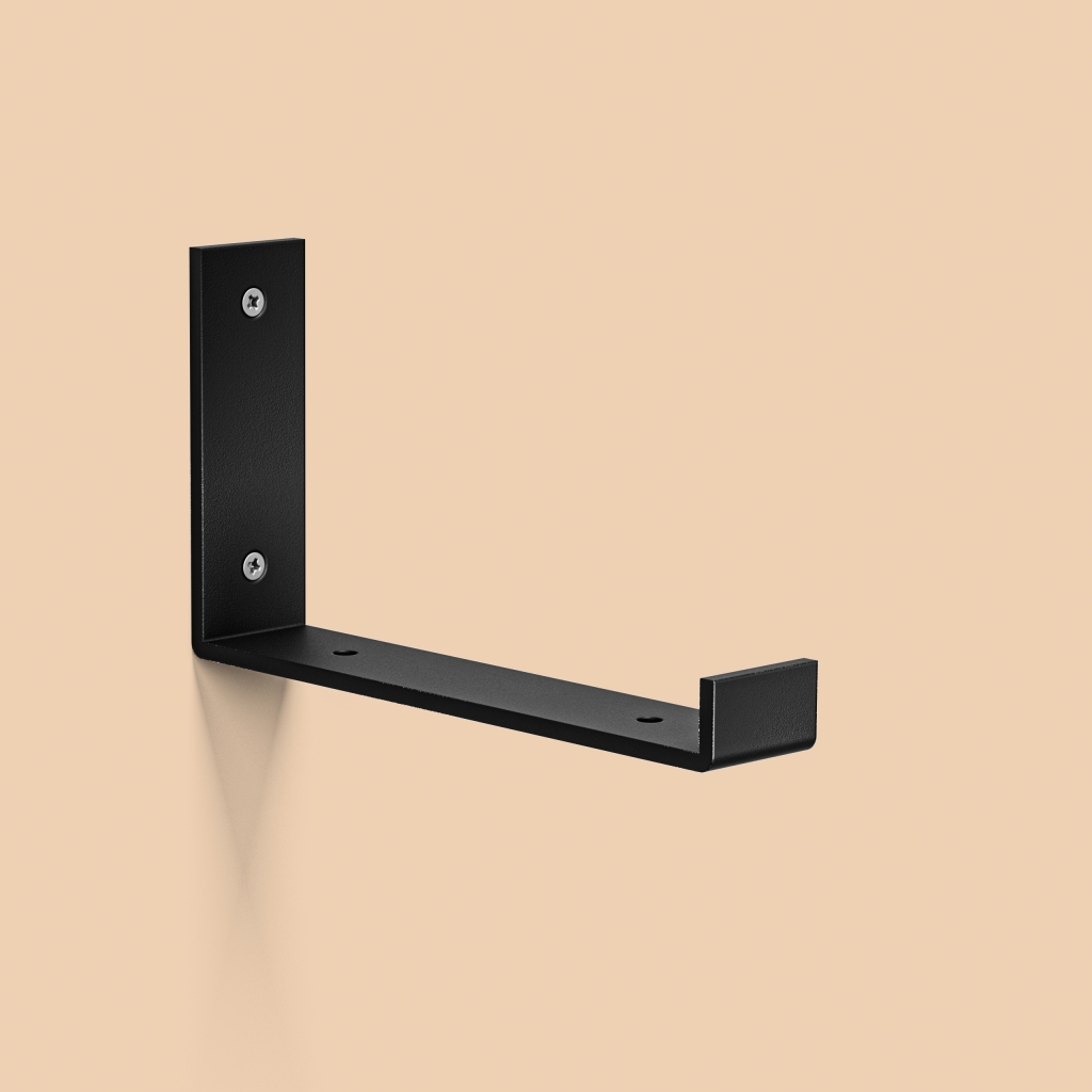Rejäl konsol i metall, pulverlackad i svart NCS S-9000. Förborrade hål