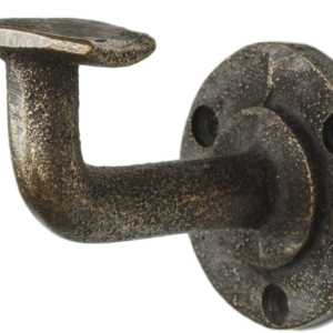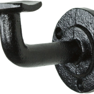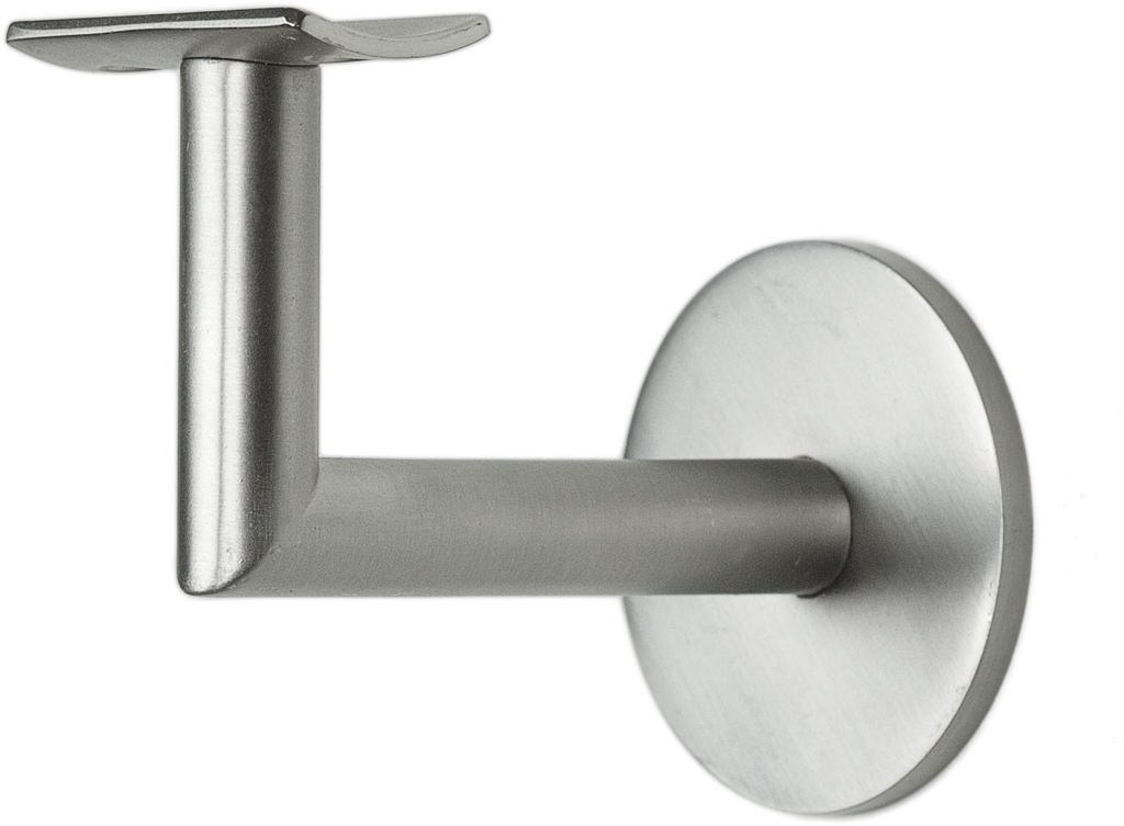 Ledstångskrok där måttet mellan centrum på fästet och väggen är 64 mm och monteringsplattans diameter är 50 mm. Säljes i par. För inomhusbruk.