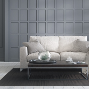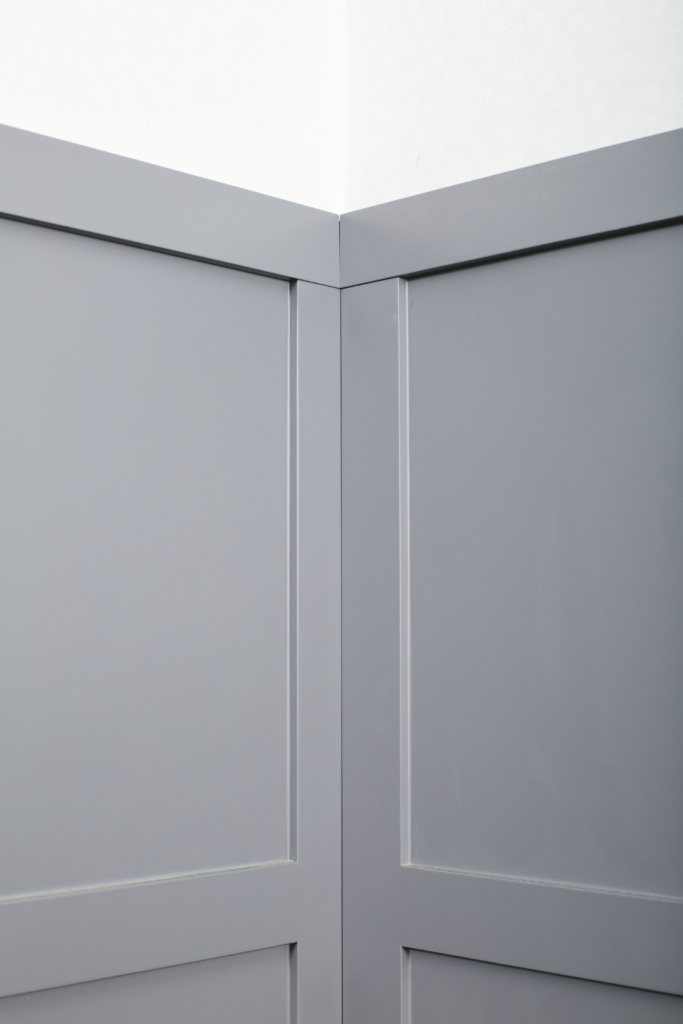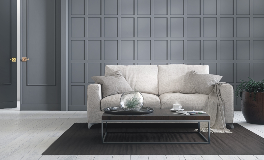 Färdigmålad panelskiva av FSC-certifierad 3 mm tjock hdf med monterat listverk. Monteras med dolda skarvar. Som bröstpanel bygger Herrgård 1340 mm, dubbla rader som fondvägg bygger panelen max 2580 mm. Två skivor per paket.