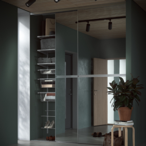 Skjutdörr i fast mått bredd 610 mm för öppningshöjd 2355mm. Silverfärgad aluminiumram 12mm, 4mm fyllning av spegelglas med säkerhetsfilm