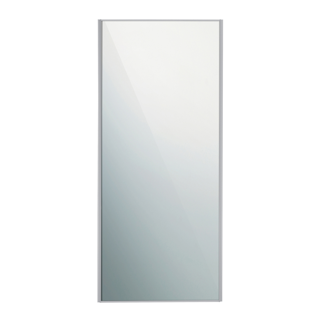 Skjutdörr i fast mått bredd 914mm för öppningshöjd 2355mm. Silverfärgad galvaniserad ram, 4 mm fyllning av spegelglas med säkerhetsfilm.
