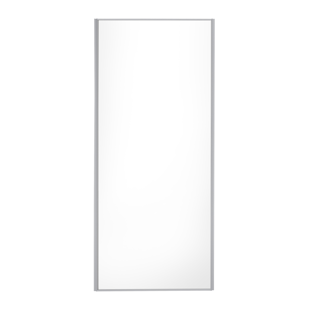 Skjutdörr i fast mått bredd 610mm för öppningshöjd 2355mm. Silverfärgad stålram med 8 mm fyllning i vit melaminbelagd spånskiva 8 mm