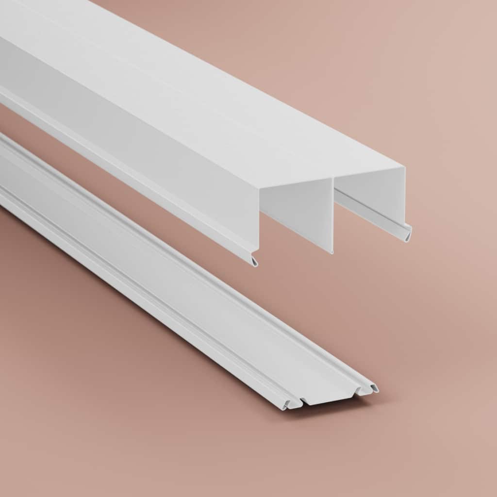 Tak- och golvskena till skjutdörr Standard och Nordic. Vitfolierade på stålprofil. Takskenans mått: 1803x90x40. Golvskenans mått: 1803x55x5.