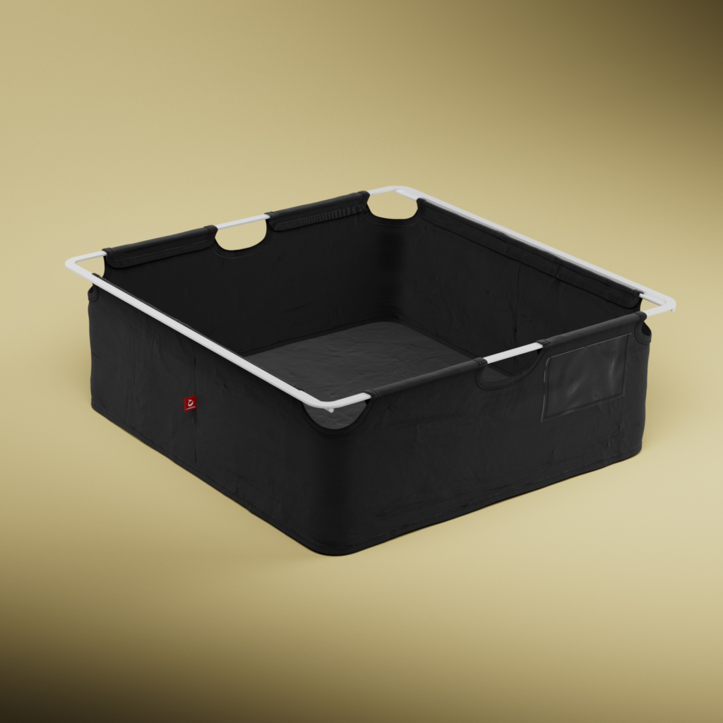 Tygback i dubbelt polyestertyg med uttagbar botten och kardborrfästen på insidan. Tvätt- och strykbar. Försedd med plastficka för medföljande etikett. Höjden tar 2 skenor i stativgavlarna.