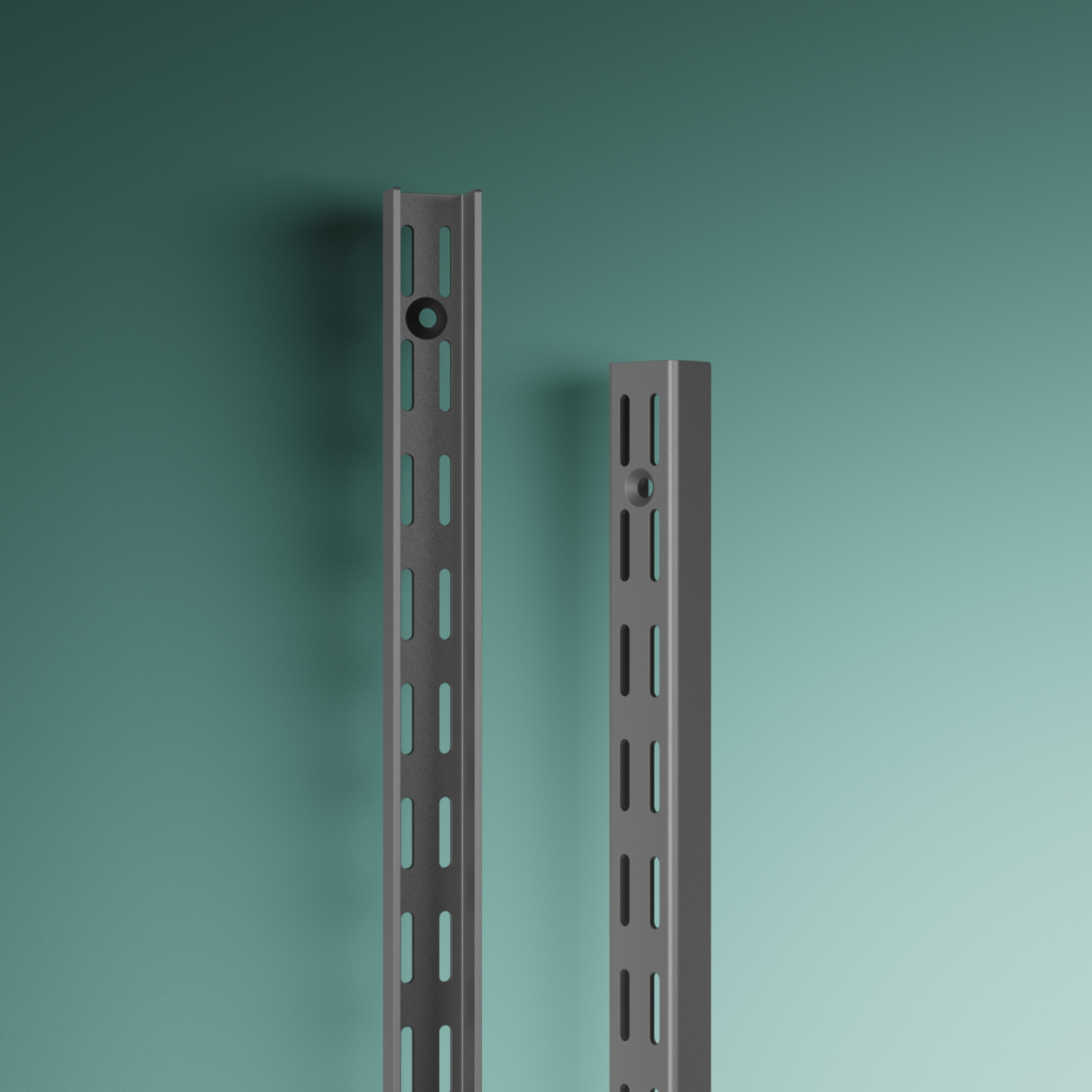 Skena för väggfast montering. Skena skruvas fast i väggen. Kan kapas till önskad längd. 3 skruvhål. Avståndet mellan varje skena bör inte överstiga 900 mm.